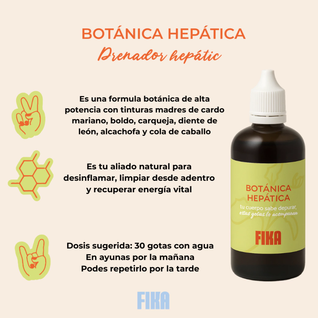 FIKA Botánica Hepática combina cola de caballo, carqueja, boldo, cardo mariano, diente de león y alcachofa, plantas reconocidas por su acción hepatoprotectora, antioxidante y depurativa.
