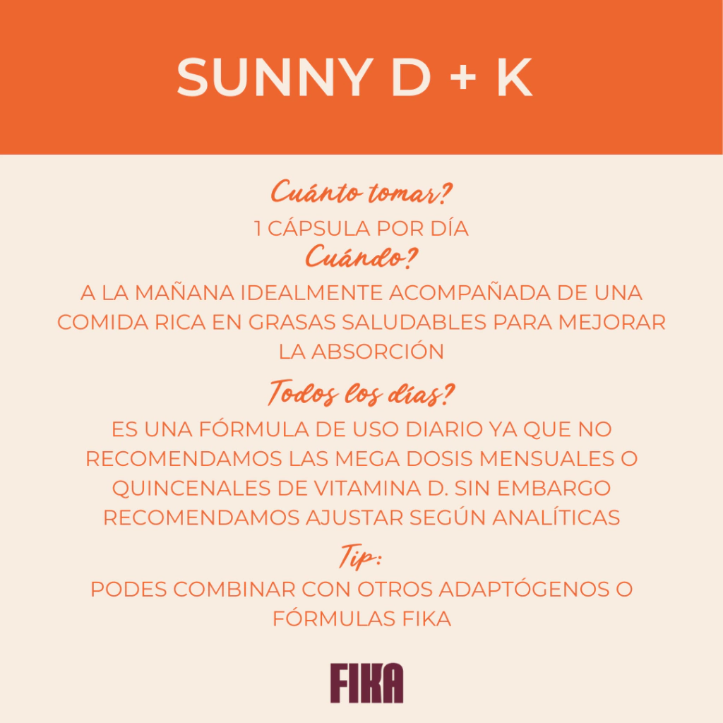 Con FIKA Sunny D + K2 obtenés la sinergia perfecta en una sola cápsula: 4000 UI de Vitamina D3 y 100 mcg de Vitamina K2 (MK-7) de alta biodisponibilidad.