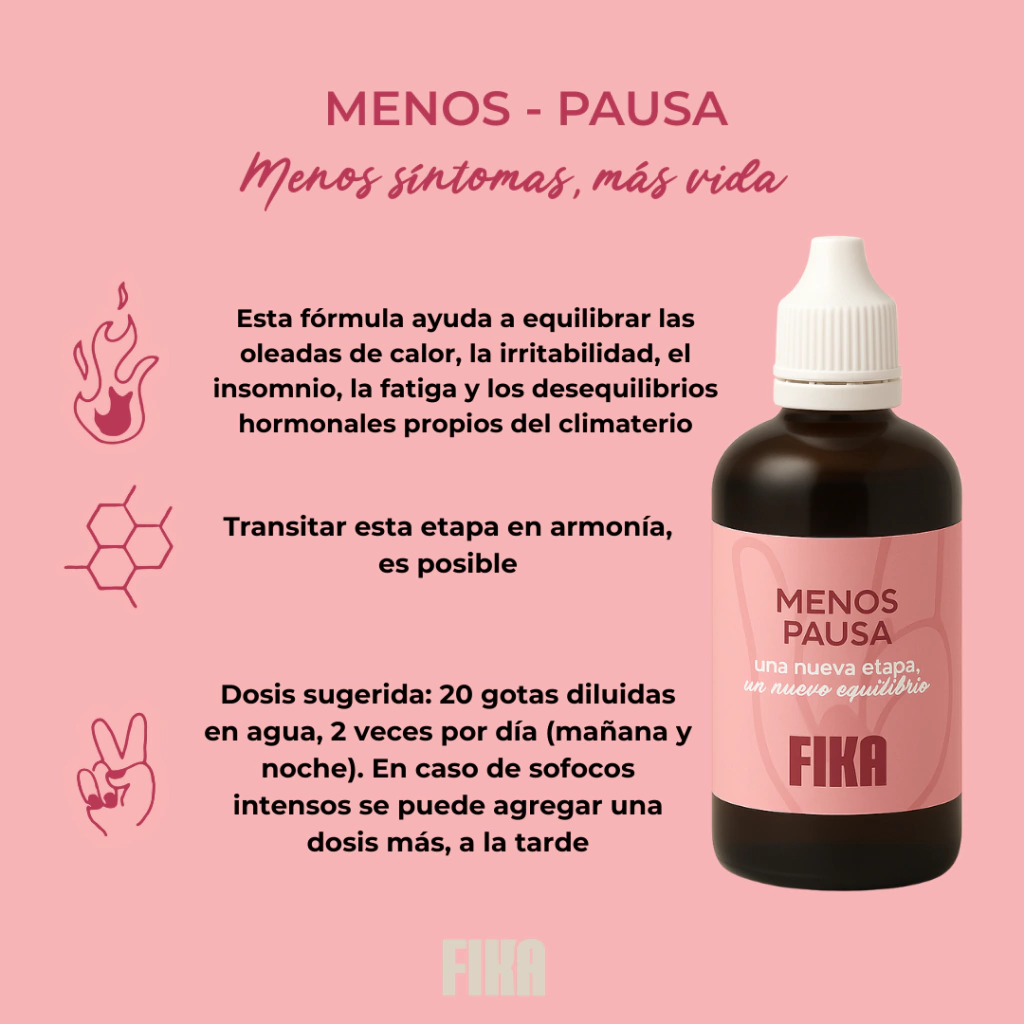 FIKA Menos-Pausa es una fórmula única que combina tinturas madres de cimicífuga y valeriana con una selección de remedios homeopáticos (sepia, lachesis, pulsatilla, sulphur, aconitum y china en 6°), diseñada para equilibrar el cuerpo y acompañar la transición de manera natural.